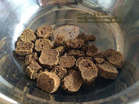 味道很香不同於一邊市面上飼料的味道且市面上飼料偏油,摸玩手上都會油油的;而這款味道很香且手上不會殘留油,聞起來像烘乾鮮食的味道;大小適中、軟硬適中,內容不但有牛肉外還添加番茄、鯊魚肉、南瓜等,每款飼料比例為80%人類食用等級新鮮純肉&內臟+20%新鮮蔬果及豐富營養素